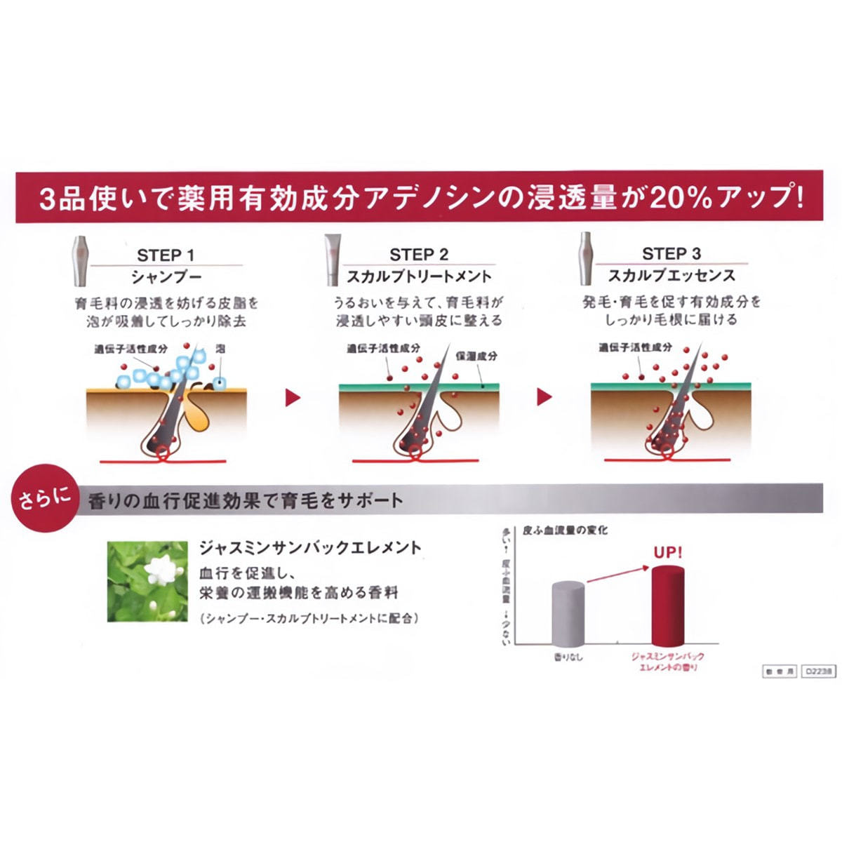 アデノバイタル スカルプエッセンスを単品で使用するより、シャンプー、スカルプトリートメントとともにシステム使用することで、毛根へのアデノシン浸透量が増加し、更に高い育毛効果が期待できます。